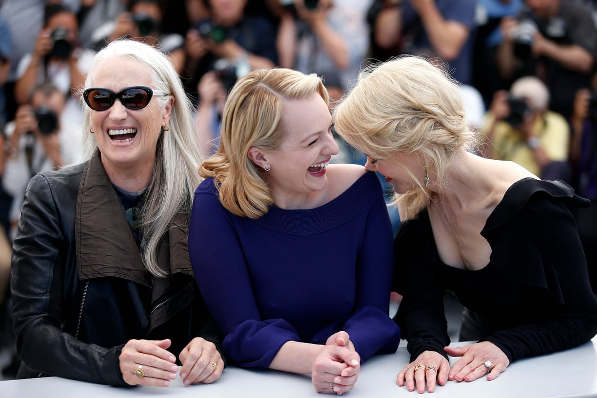 Director Jane Campion, left, and actors Elisabeth Moss and Nicole Kidman, right, share a joke during the photocall for Top of the Lake: China Girl at the Cannes film festival