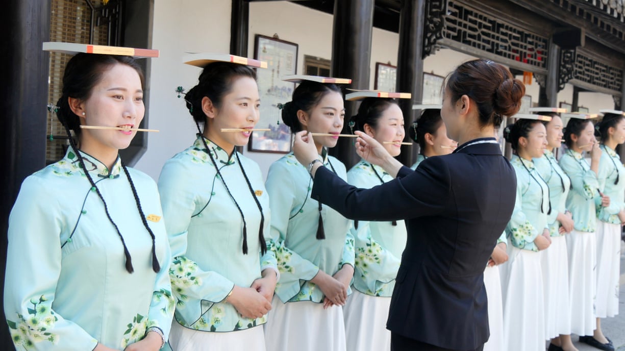 Tourist guides balance books on their heads during an etiquette training class at Slender West Lake, a traditional Chinese lakeside garden