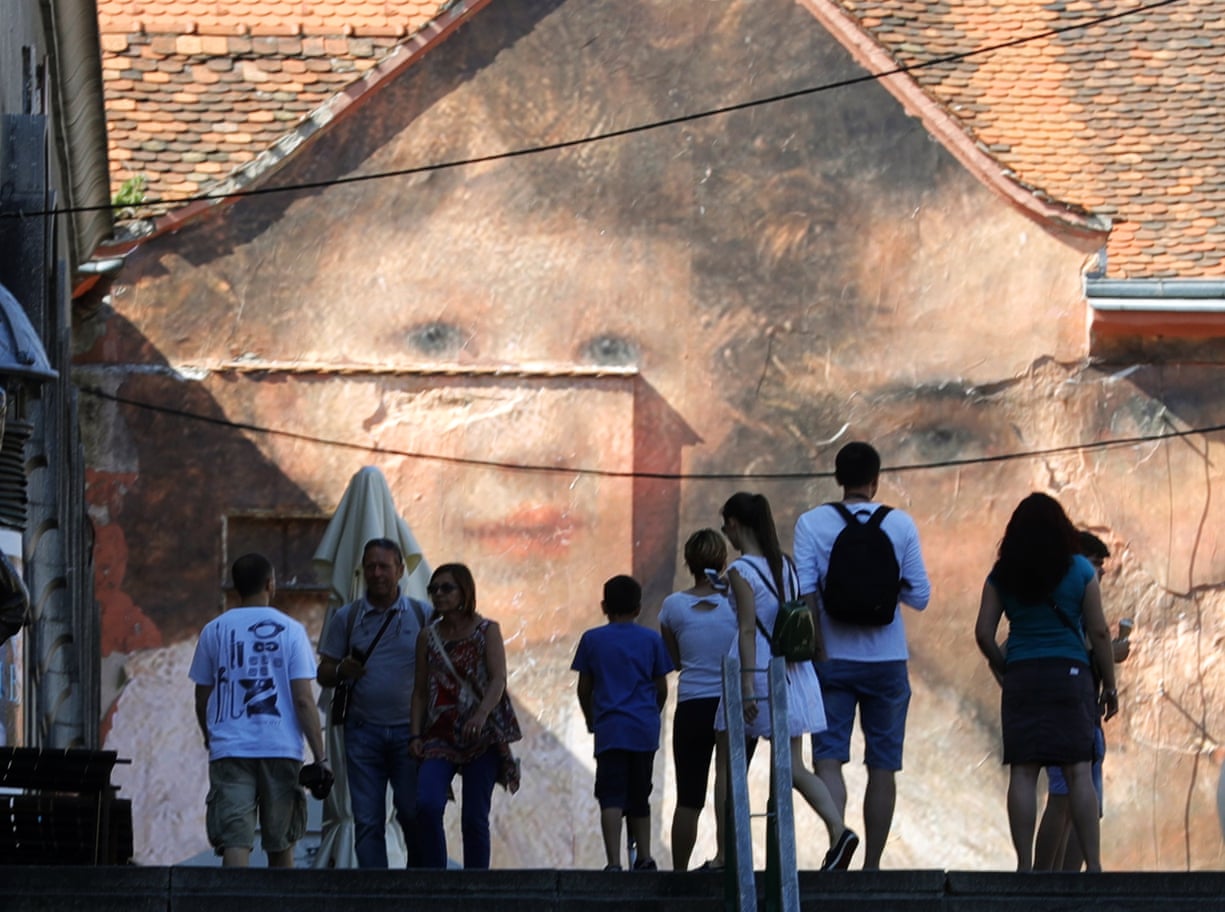 Tourists look at an mural by Julien De Casablanca, whose Outings Project reproduces paintings from museums in streets all over the world
