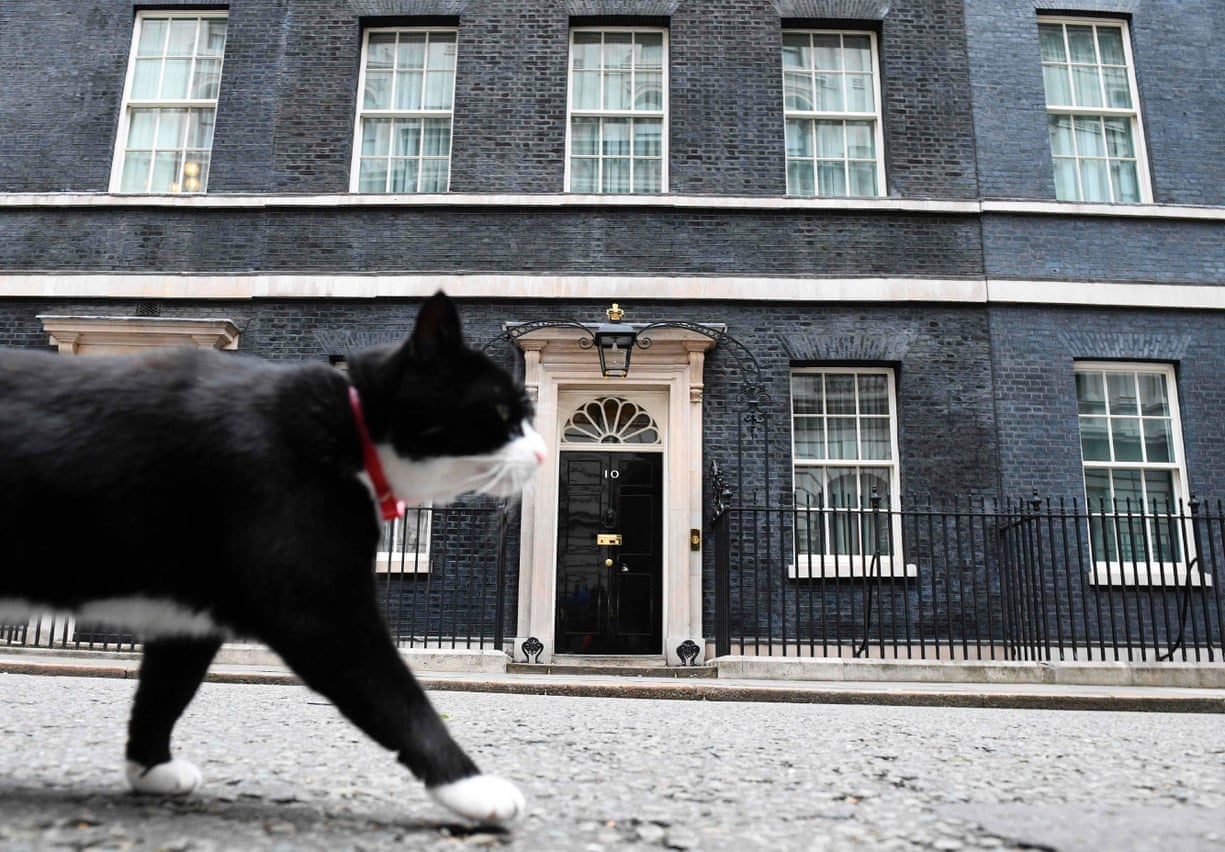 Palmerston, the Foreign Office cat, walks past 10 Downing Street as photographers await an appearance by the prime minister, Theresa May