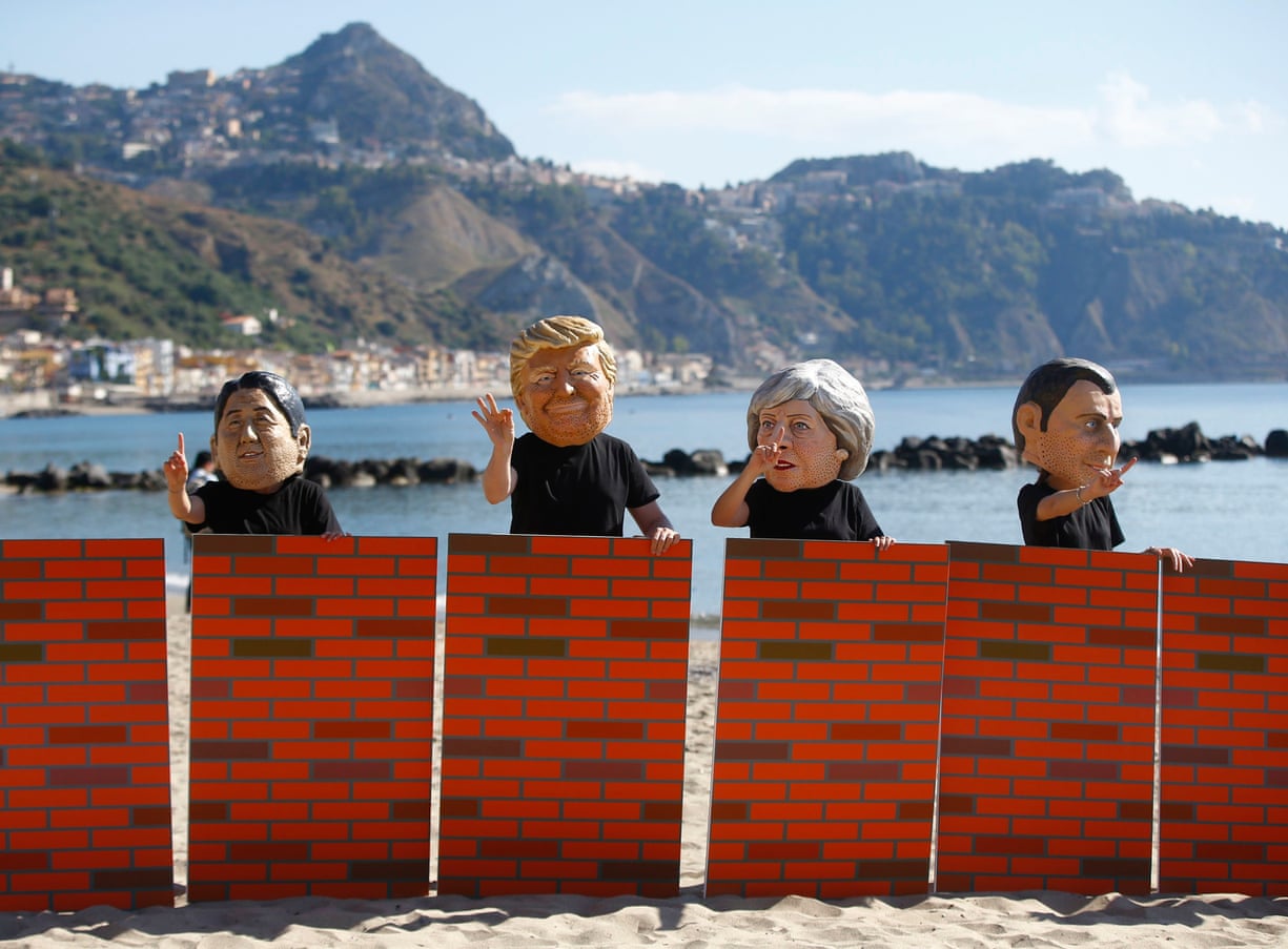 Protesters wear masks depicting the G7 leaders Shinzō Abe, Donald Trump, Theresa May and Emmanuel Macron at a demonstration organised by Oxfam